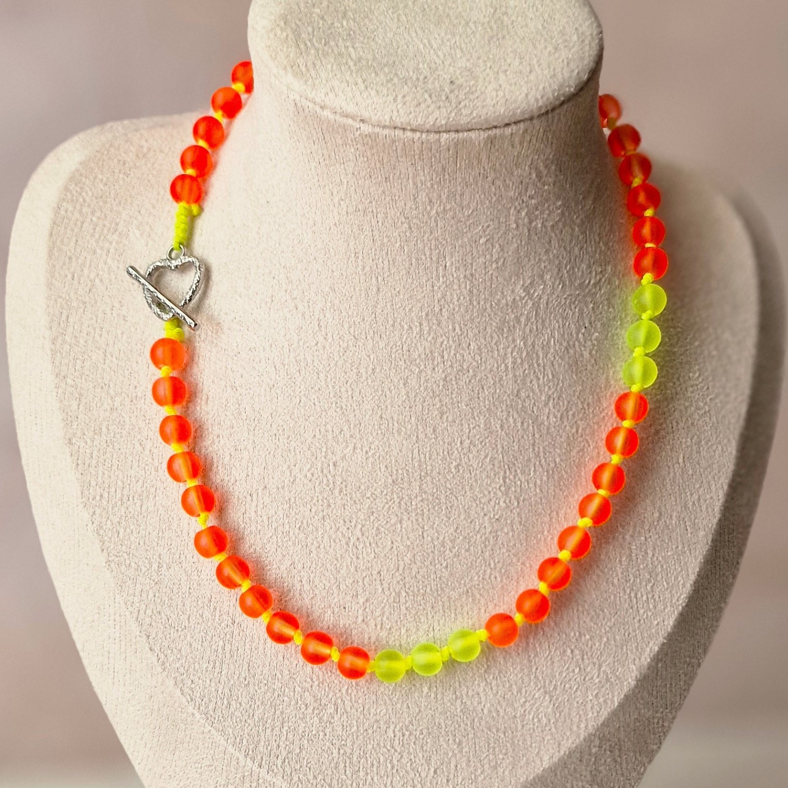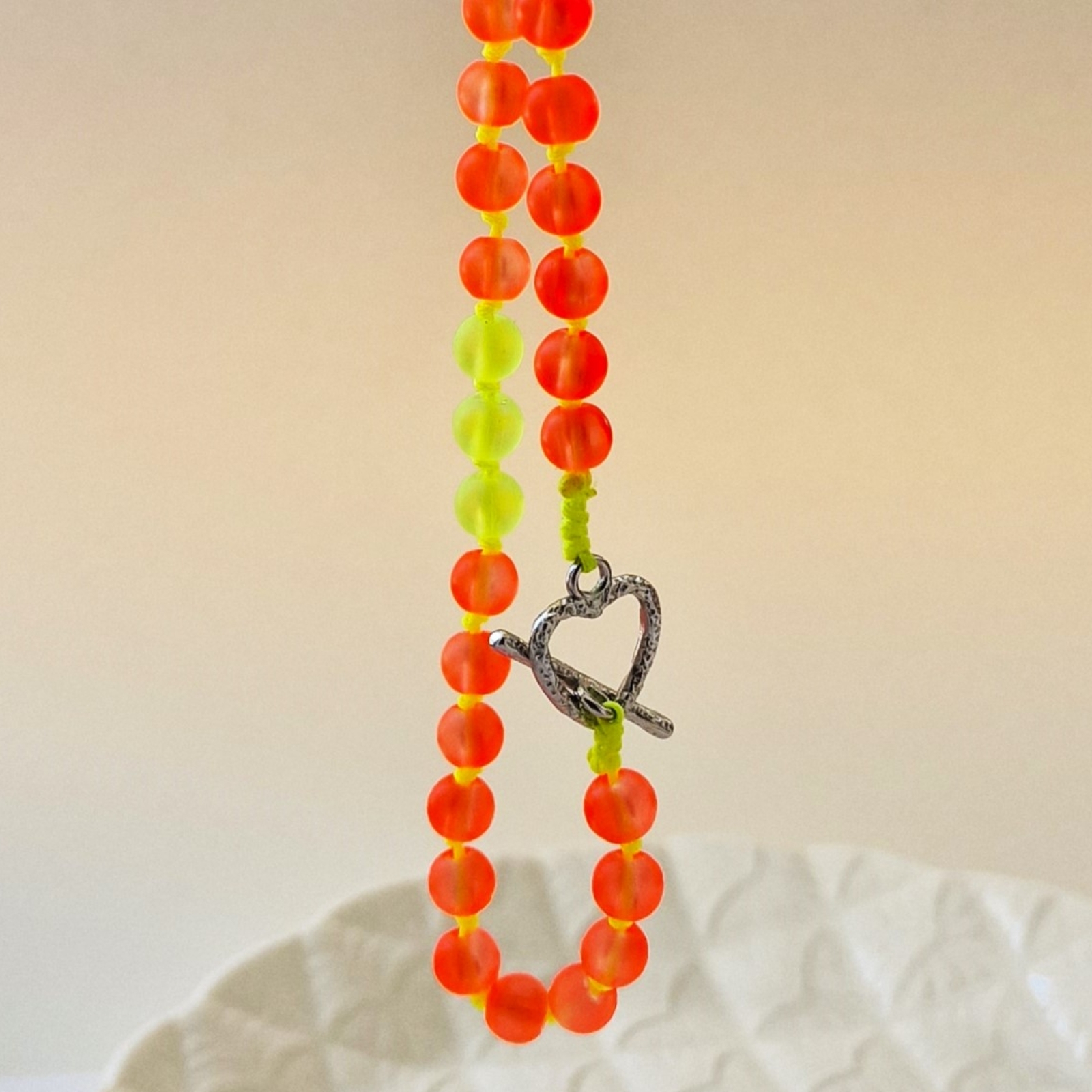 Colierul contine margele frosted, portocaliu neon si galben neon, cu sistem de inchidere in forma de inima, din otel inoxidabil.