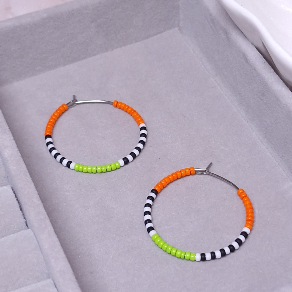 Cerceii contin margele din sticla, avand culori vibrante portocaliu, verde, negru si alb.