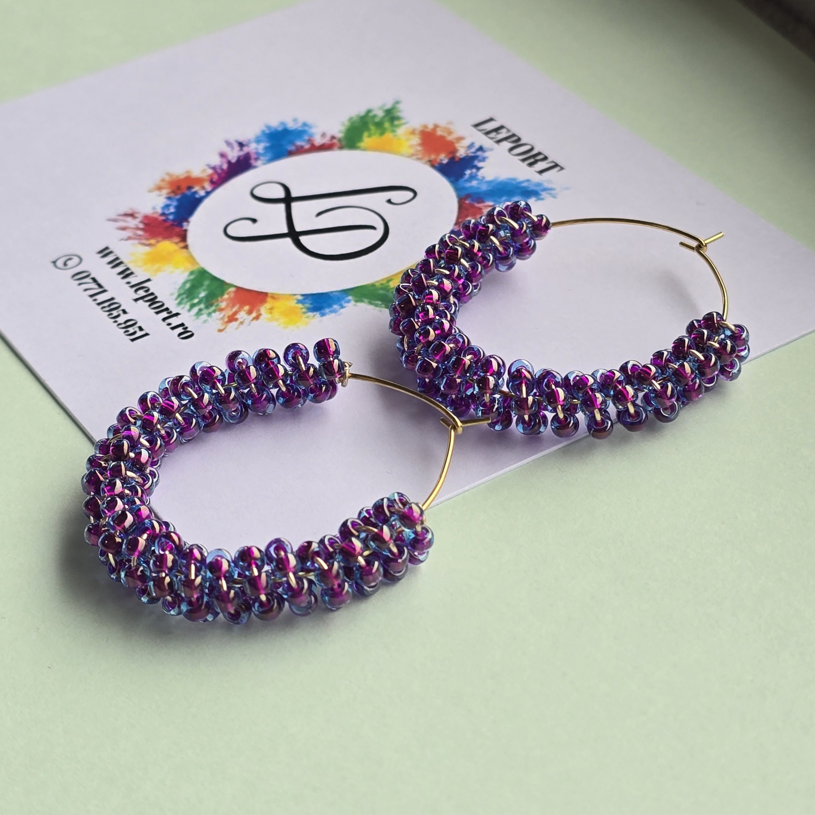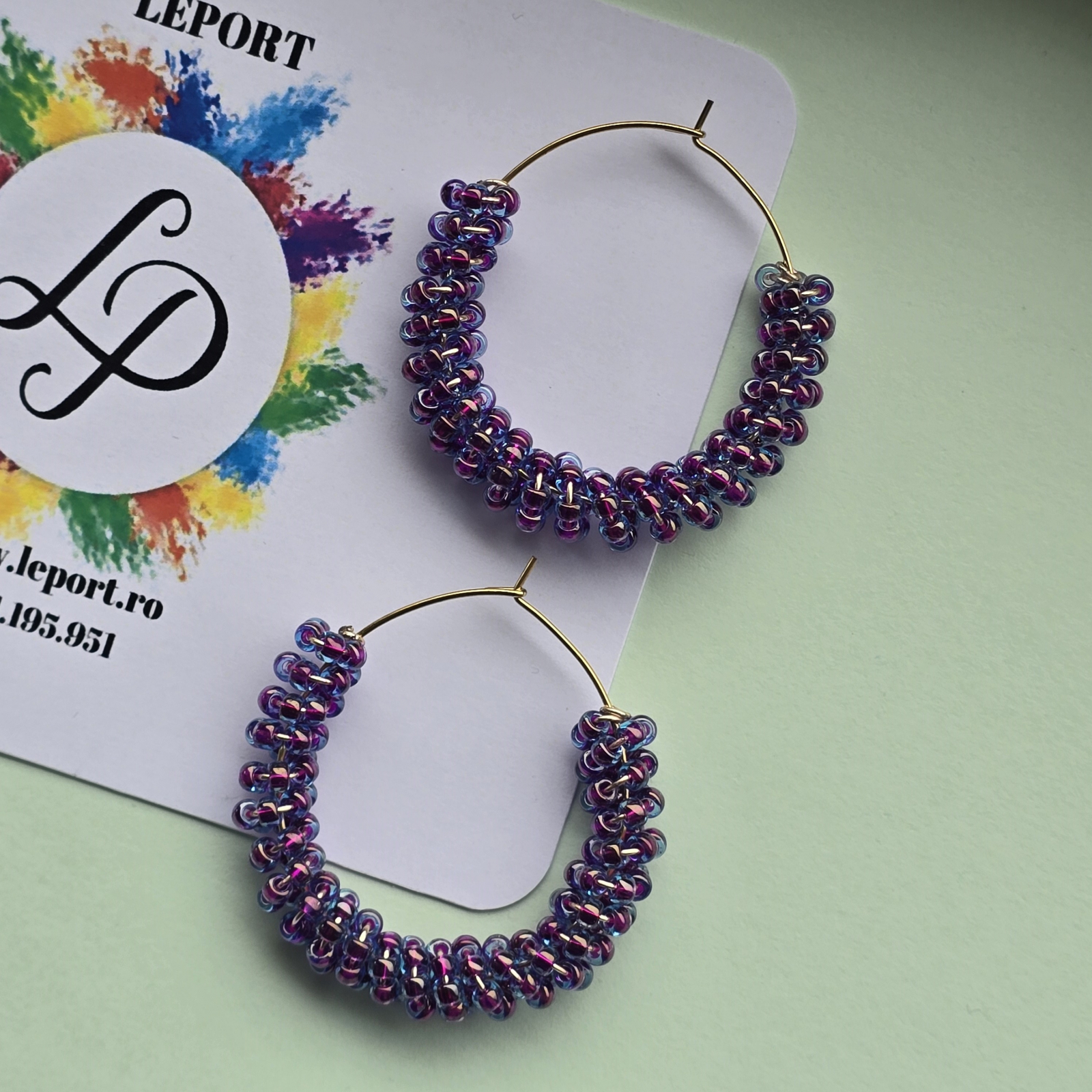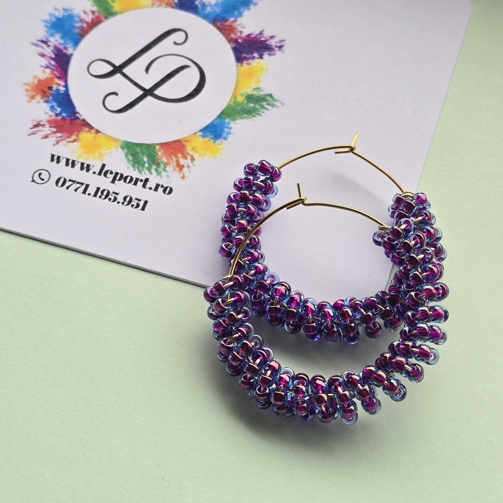 Cerceii sunt confectionati din margele de sticla de culoare mov.