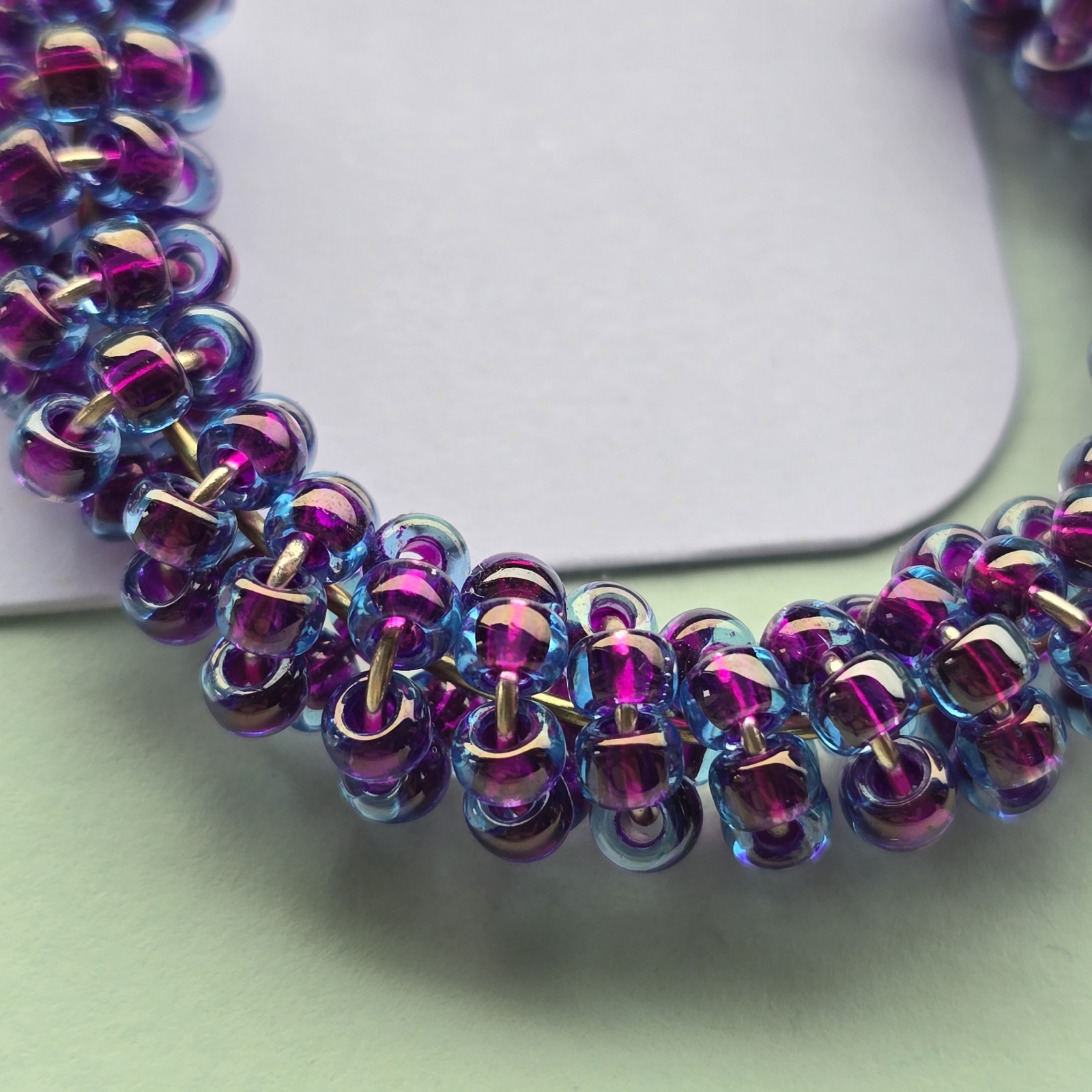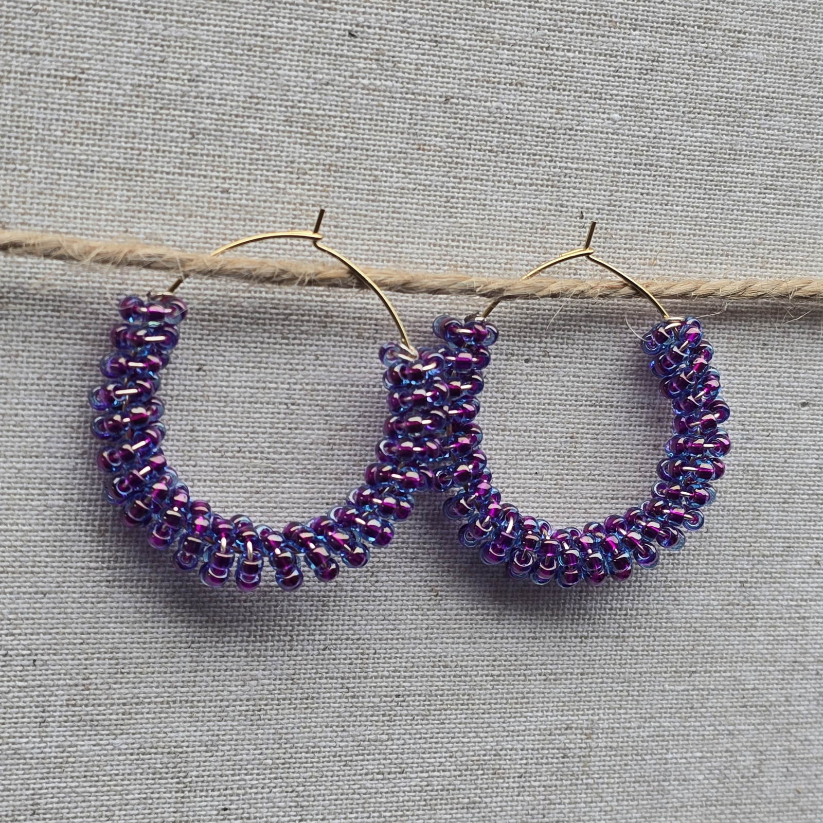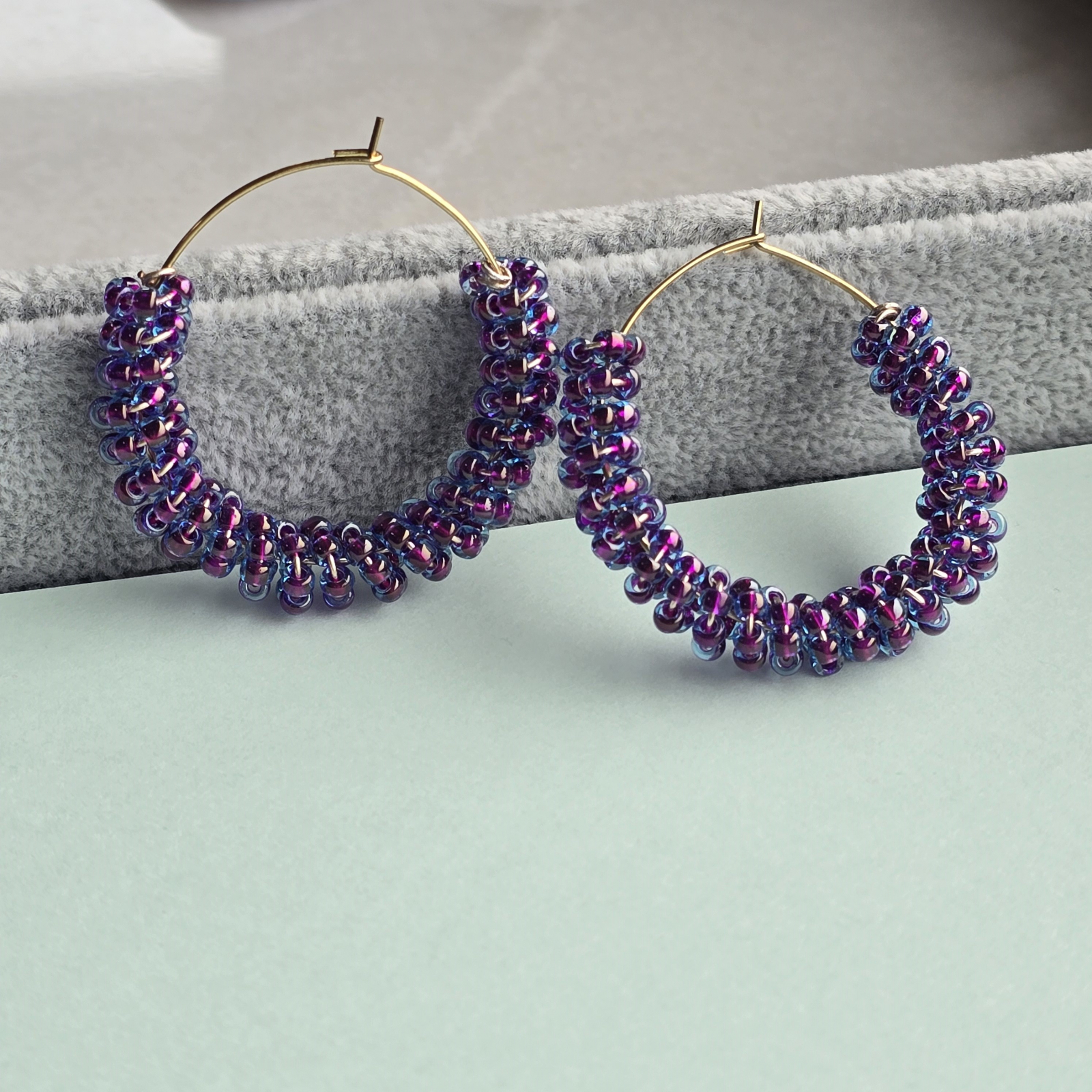 Cerceii sunt confectionati din margele de sticla de culoare mov.